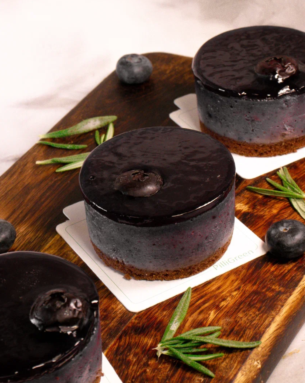 Чизкейк на основе кокосовых сливок, орехов кешью и синего чая, внутри находится свежая голубика, сверху чизкейк покрыт натуральной глазурью на основе сиропа из топинамбура, на бисквите из безглютеновой муки.