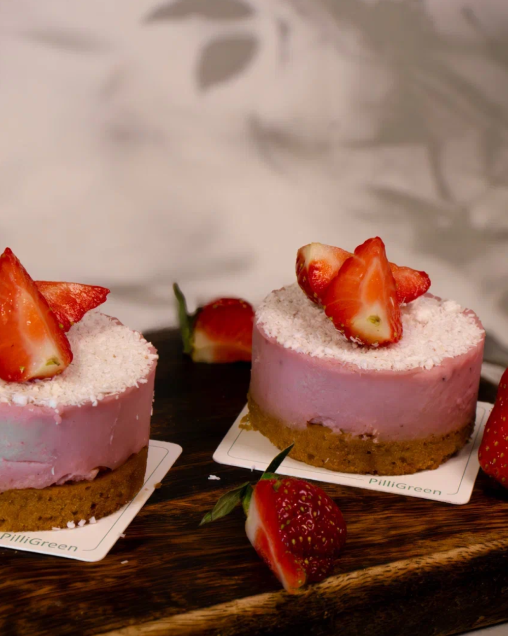 Чизкейк на основе кокосовых сливок, орехов кешью и свежей клубники, на основе бисквита из безглютеновой муки и кокосовой стружки, внутри находится свежая клубника.