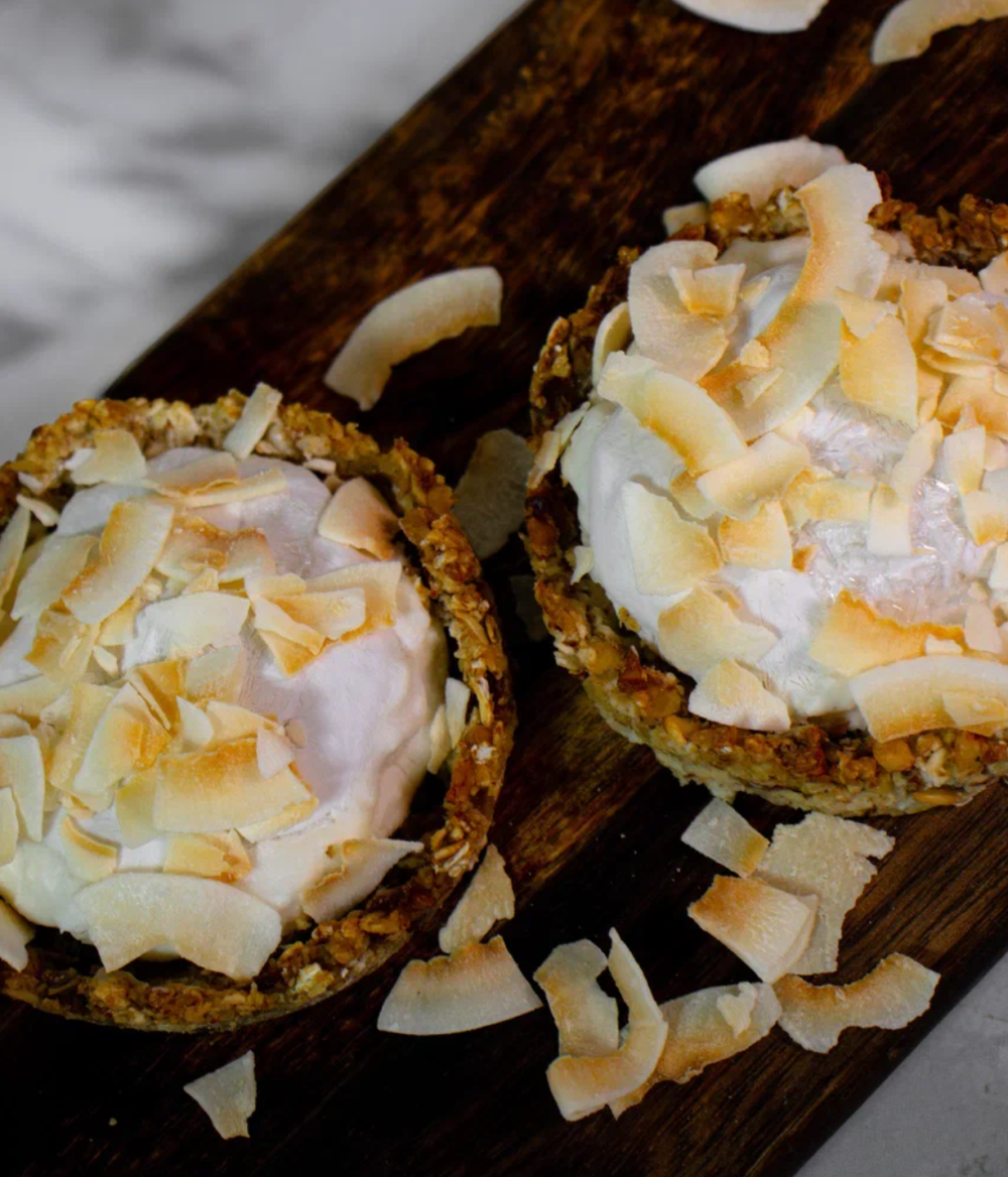 Хрустящая основа из злаков, банана и сухофруктов, с добавлением кокосовых чипсов и нежной начинки из кокосовых сливок.