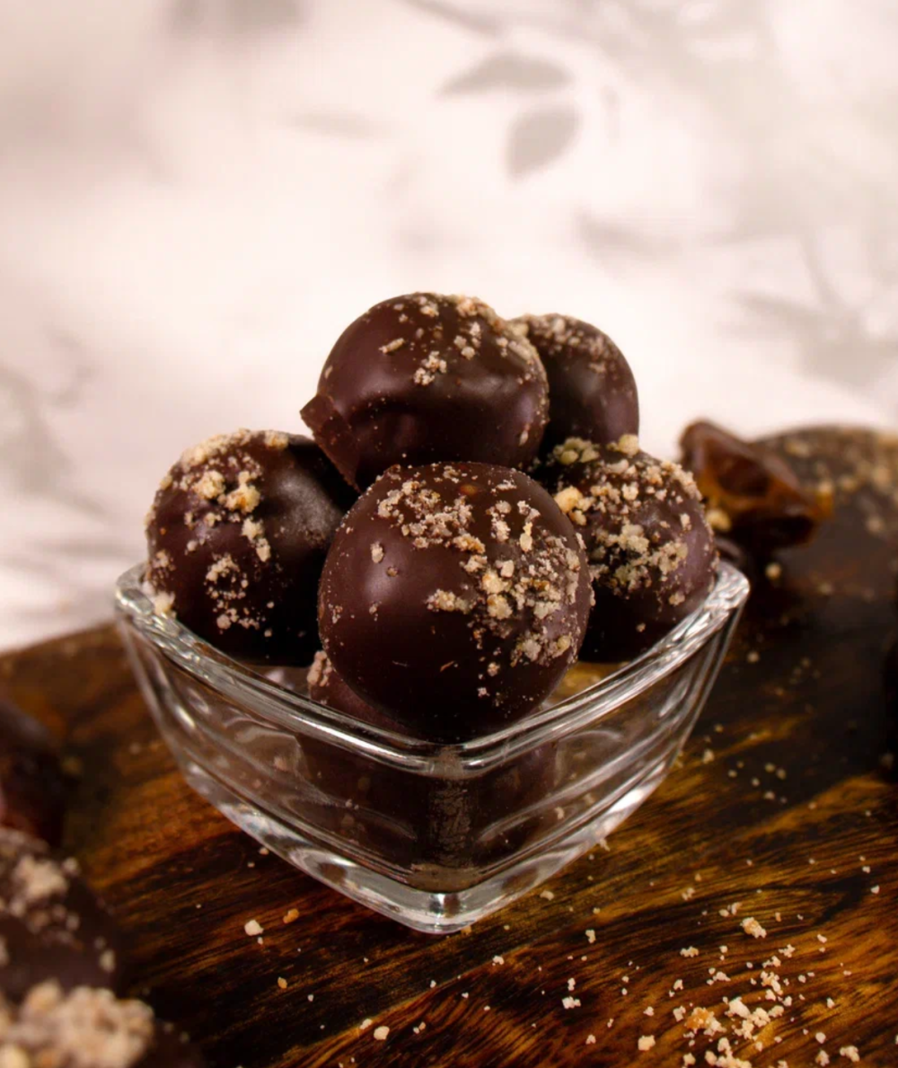 Конфета из сухофруктов, с добавлением злаков, сверху покрыта глазурью из тёмного шоколада, украшенные молотым орехом.