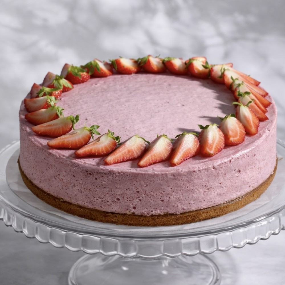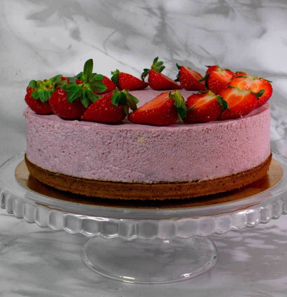 Веганский мусс из клубники, с добавлением кокосовых сливок и кешью, с начинкой из натурального манго на бисквите из безглютеновой муки.