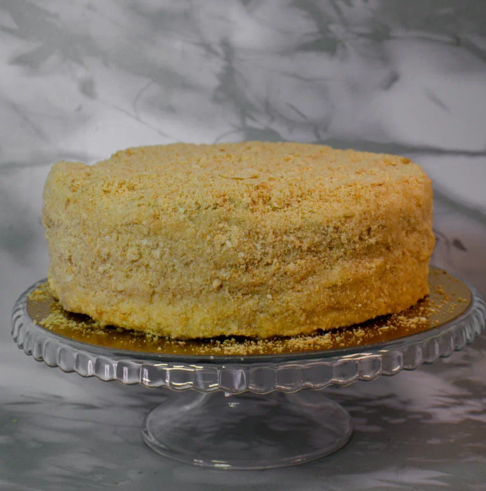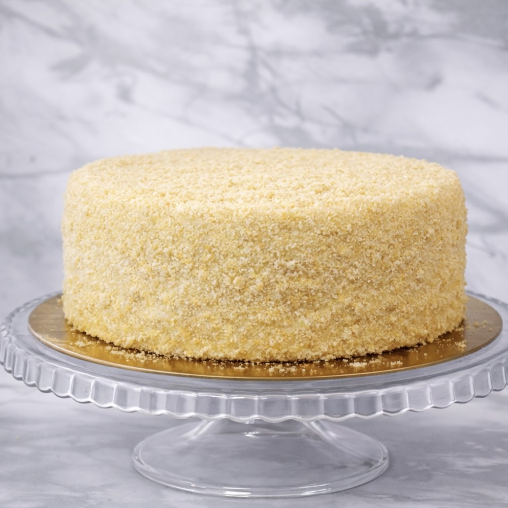 Классические слоёные коржи, пропитанные заварным кремом на основе молока и яиц, обсыпанный крошкой.