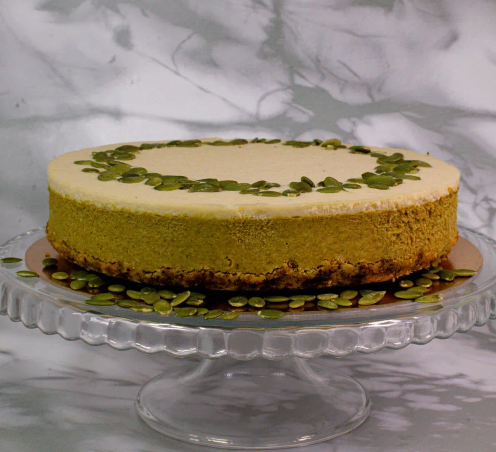 Пряный мусс из тыквы, кокосовых сливок и орехов кешью, с добавлением имбиря, мускатного ореха и куркумы, основа десерта состоит из сухофруктов, злаков.