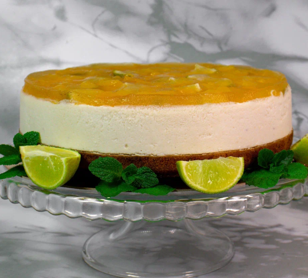 Нежный кокосовый мусс на основе кокосовых сливок и орехов кешью, украшенный сверху желе из манго и лайма, на основе бисквита из безглютеновой муки.