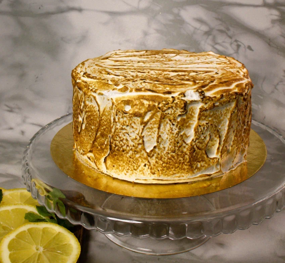 Ванильный бисквит, пропитанный сливочной пропиткой, с добавлением черничного кули и лимонного курда, покрыт итальянской меренгой.